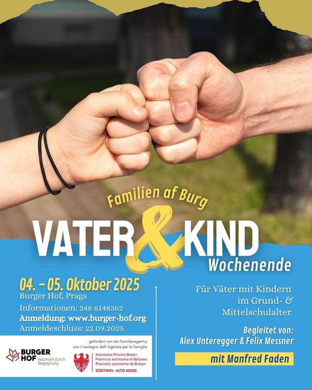 Natur macht lebendig, neugierig und mutig. Sie bietet ein ganz besonderes Lernumfeld, das die Beziehung stärkt, die körperliche und seelische Gesundheit fördert und Papas wie Kinder ermuntert, mehr voneinander zu erfahren. Väter fördern die Entwicklung ihrer Kinder durch einzigartige Weise im gemeinsamen Tun, in der Auseinandersetzung, als Vorbild. „Af Burg“ in Prags werden Kinder und ihre Papas in die Natur eintauchen, gemeinsame Nähe erfahren und Abenteuer erleben, die verbinden.